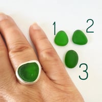 Or place your order and select your preferred piece of sea glass. All the seaglass is similar in size to the photographed example. After this, use the contact form on your order to tell me your ring size and which ring finish from plain polished, hammered or dotty you wish for your ring.